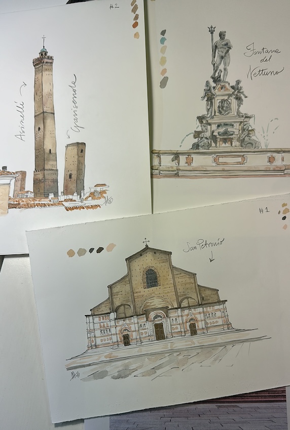 Per realizzare questi acquerelli, che ritraggono i luoghi più iconici di Bologna, ho ricordato il mio amore per i taccuini di viaggio, mia vecchia passione (trovi numerosi articoli nel blog a riguardo), cercando di vedere Bologna con gli occhi del turista e della prima volta.